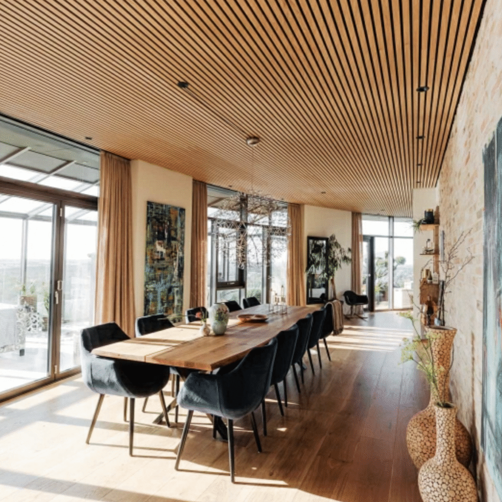 Herning Sky is characterised by an uncompromising attitude towards design, quality, choice of materials and functionality. I-Wood was chosen as supplier of strip ceilings for the construction and has since delivered and installed over 1,500 m2 in the two towers. The task was solved using I-Wood Pro+ in fire-retardant MDF and felt, which was approved by the local fire authorities.
